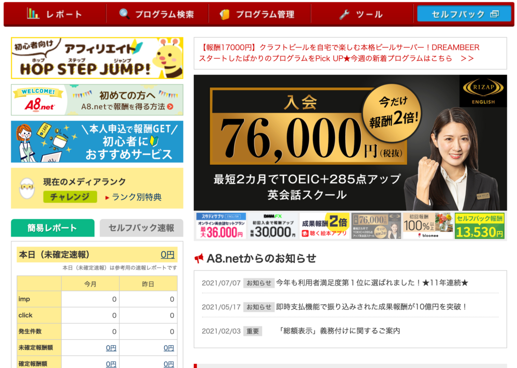 A8.netは、広告主数・登録サイト数ともに日本最大級のアフィリエイトサービスプロバイダーです。