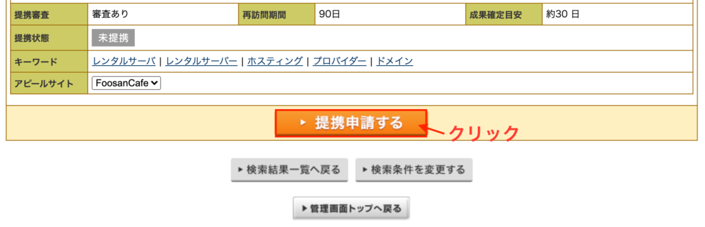 最終確認画面が表示されますので画面下部の「提携申請する」ボタンをクリックします。