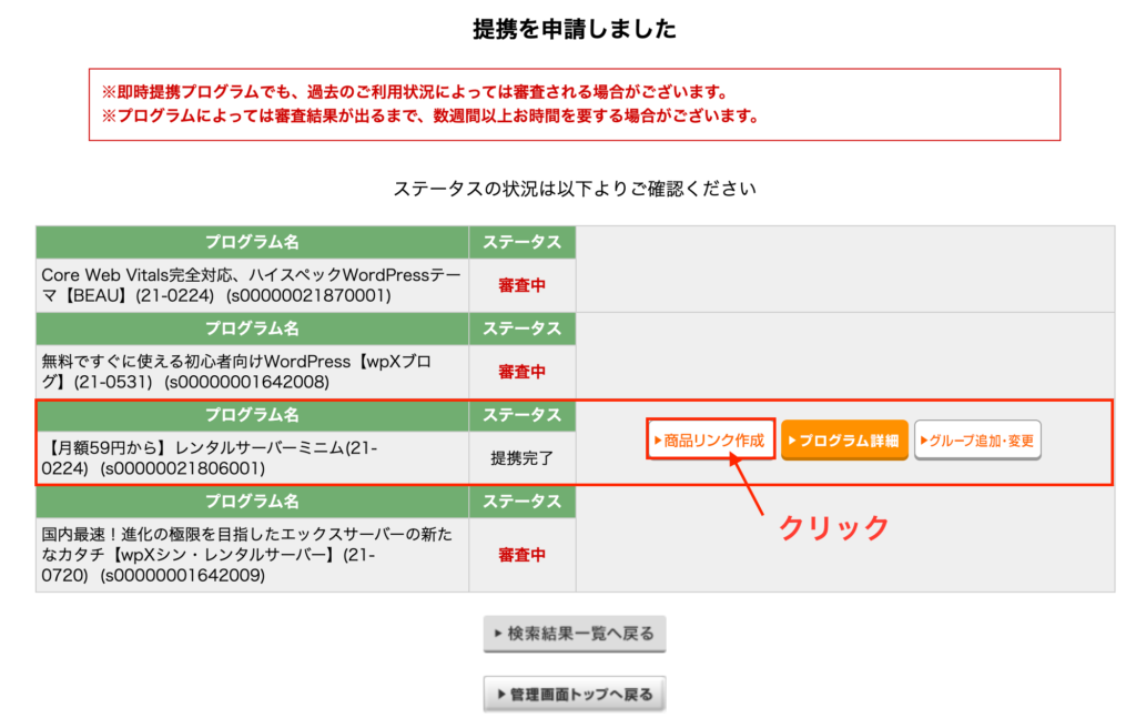 提携するサービスによっては審査がありますが即時に提携が完了するものもあります。今回は3つ目のサービスが即時に完了しています。手順はこの後ご紹介しますが、この申請画面からも「商品リンク作成」ボタンをクリックすることですぐに商品の紹介ができます。