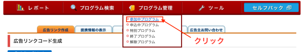 ヘッダメニュー「プログラム管理」の「参加中プログラム」をクリックします。
