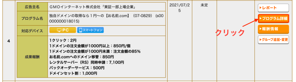 広告を表示したいサービスを選択して「プログラム詳細」ボタンをクリックします。