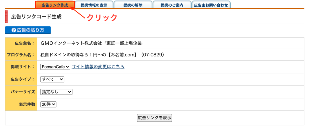 「広告リンク作成」ボタンをクリックします。