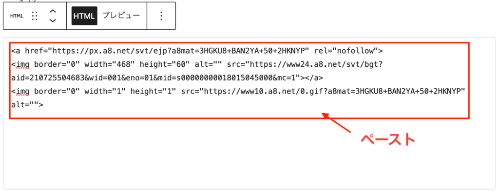 先程コピーした広告リンクをカスタムHTMLにペーストします。