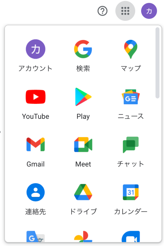 右上のアイコンから各種サービスを使えるようになります。メールを使いたいのでGmailを選択します。