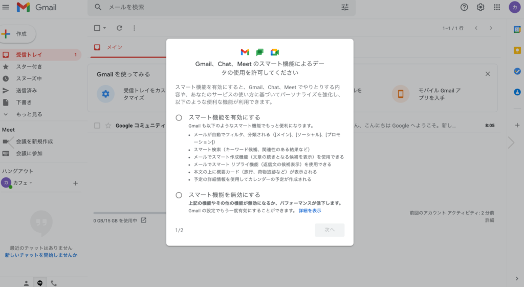 パーソナライズはアカウント情報を元に個人用に使いやすくなるという機能ですね。行動履歴が使われるのは嫌だという方は「スマート機能を無効にする」を選択すると良いと思います。今回は「スマート機能を有効にする」を選択しました。そのまま完了させます。