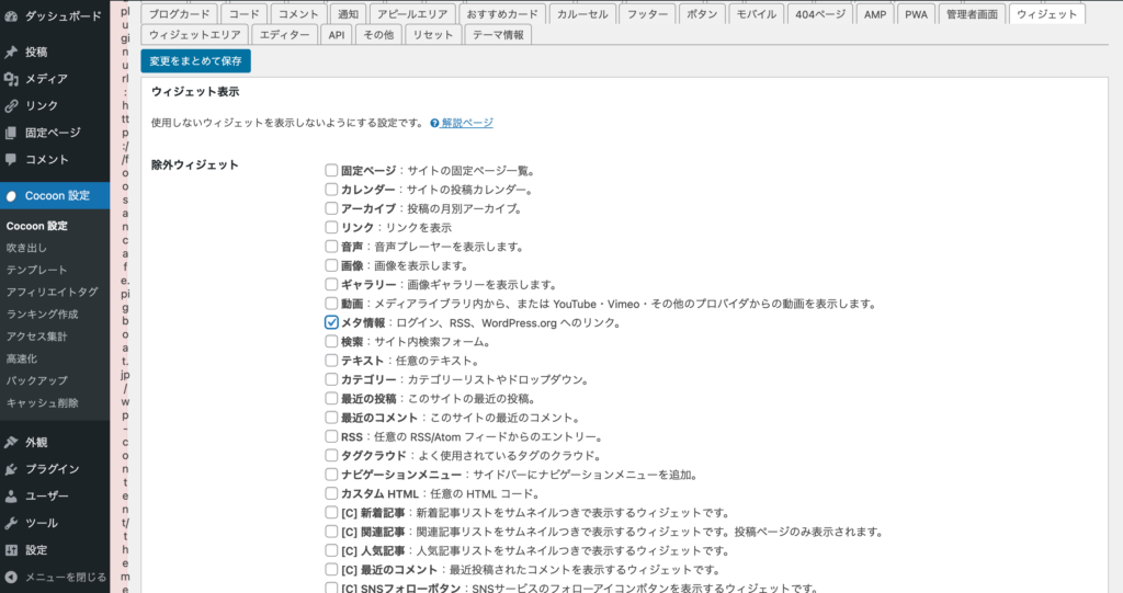 「Cocoon設定」から「ウィジェット」タブを選択して「メタ情報」にチェックを入れます。チェックを入れたものが除外されるという形になります。「変更をまとめて保存」するボタンで保存します。