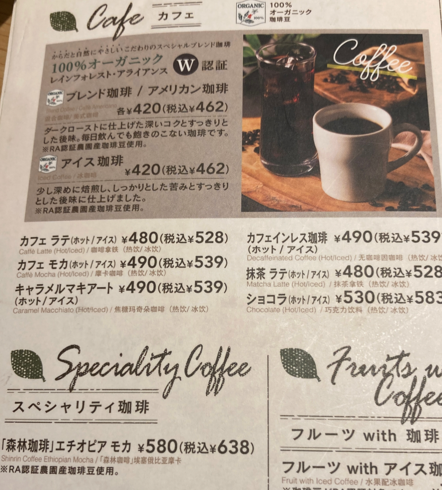 珈琲の産地は特に書いていないですが「RA認証農園産珈琲豆使用」とあります。