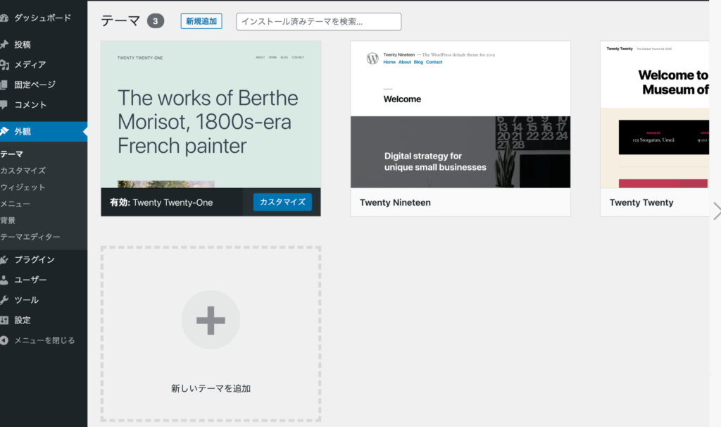 WordPressには「テーマ」と呼ばれるデザインテンプレートというがあり、テーマを追加することでサイトの見た目を好みのデザインに変更できます。