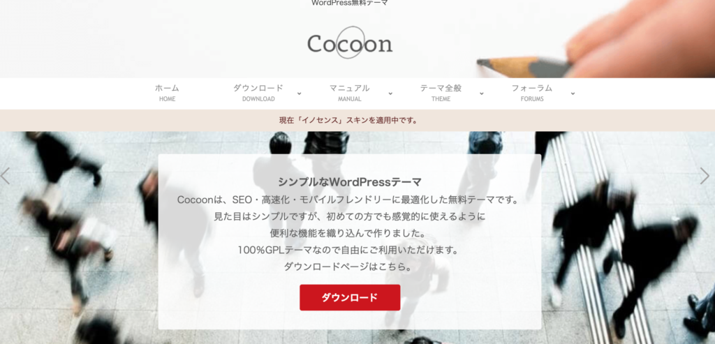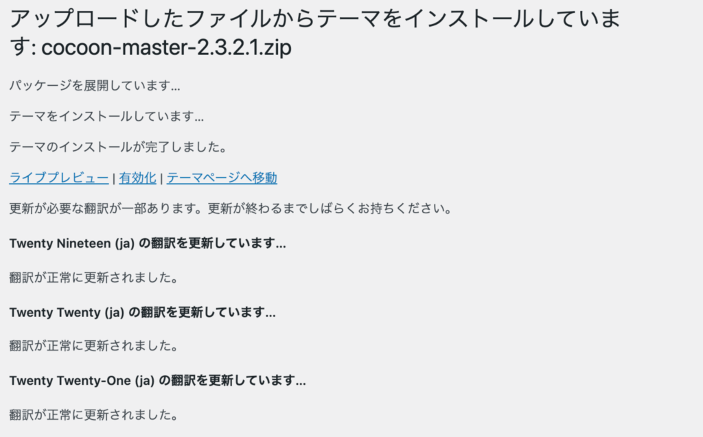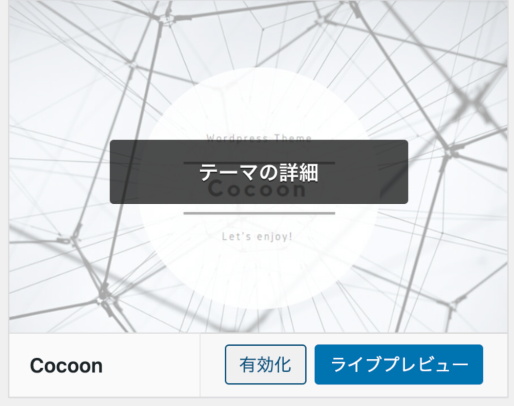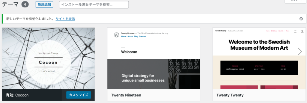 またテーマの画面に戻ると先ほどは無かった「Cocoon」が追加されていることが確認できました。早速有効化します。
